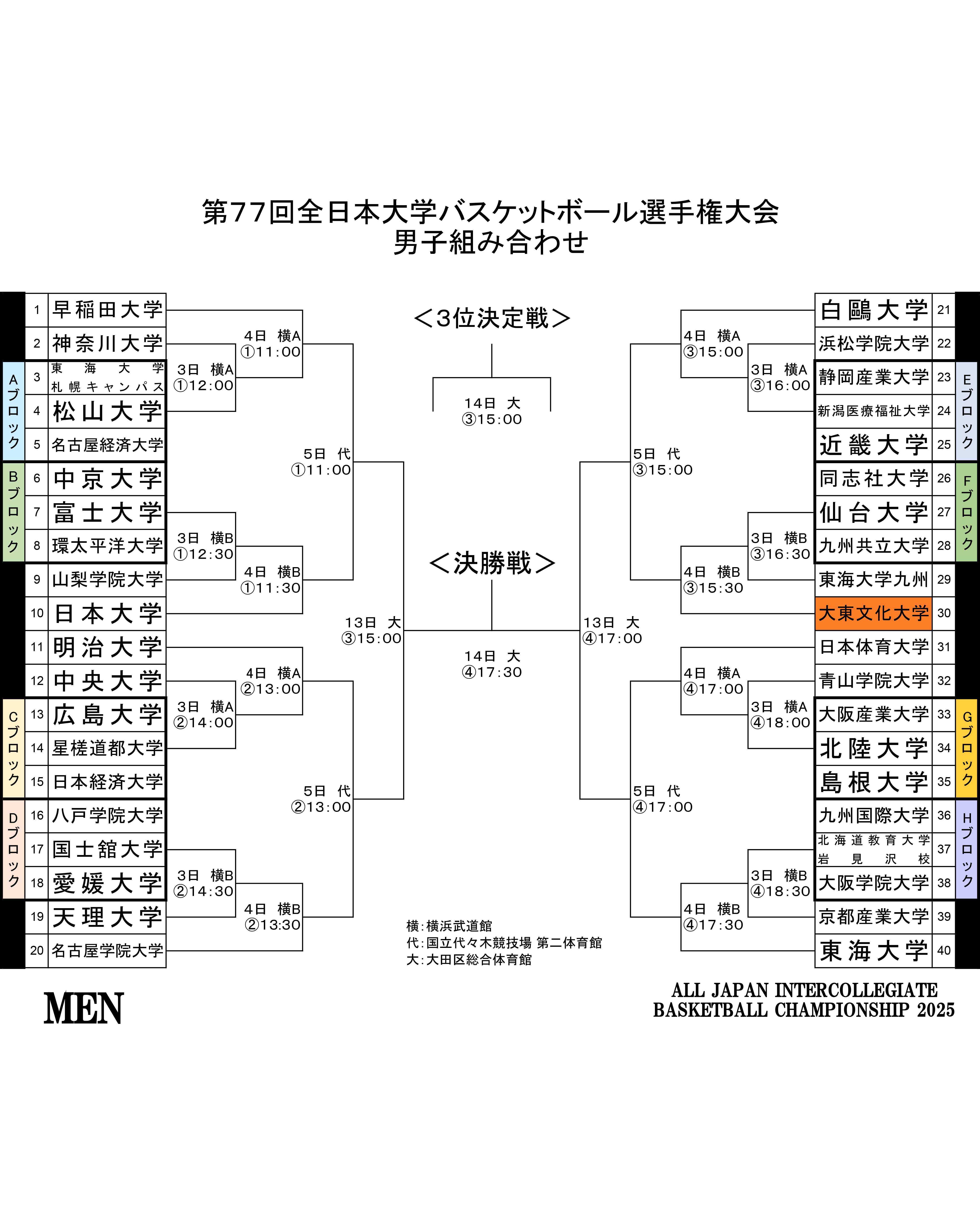 【第77回全日本大学バスケットボール選手権大会】日頃より大東文化大学男子バスケットボール部への応援をありがとうございます。「第77回全日本大学バスケットボール選手権大会」の組み合わせが発表されました。応援よろしくお願いいたします。